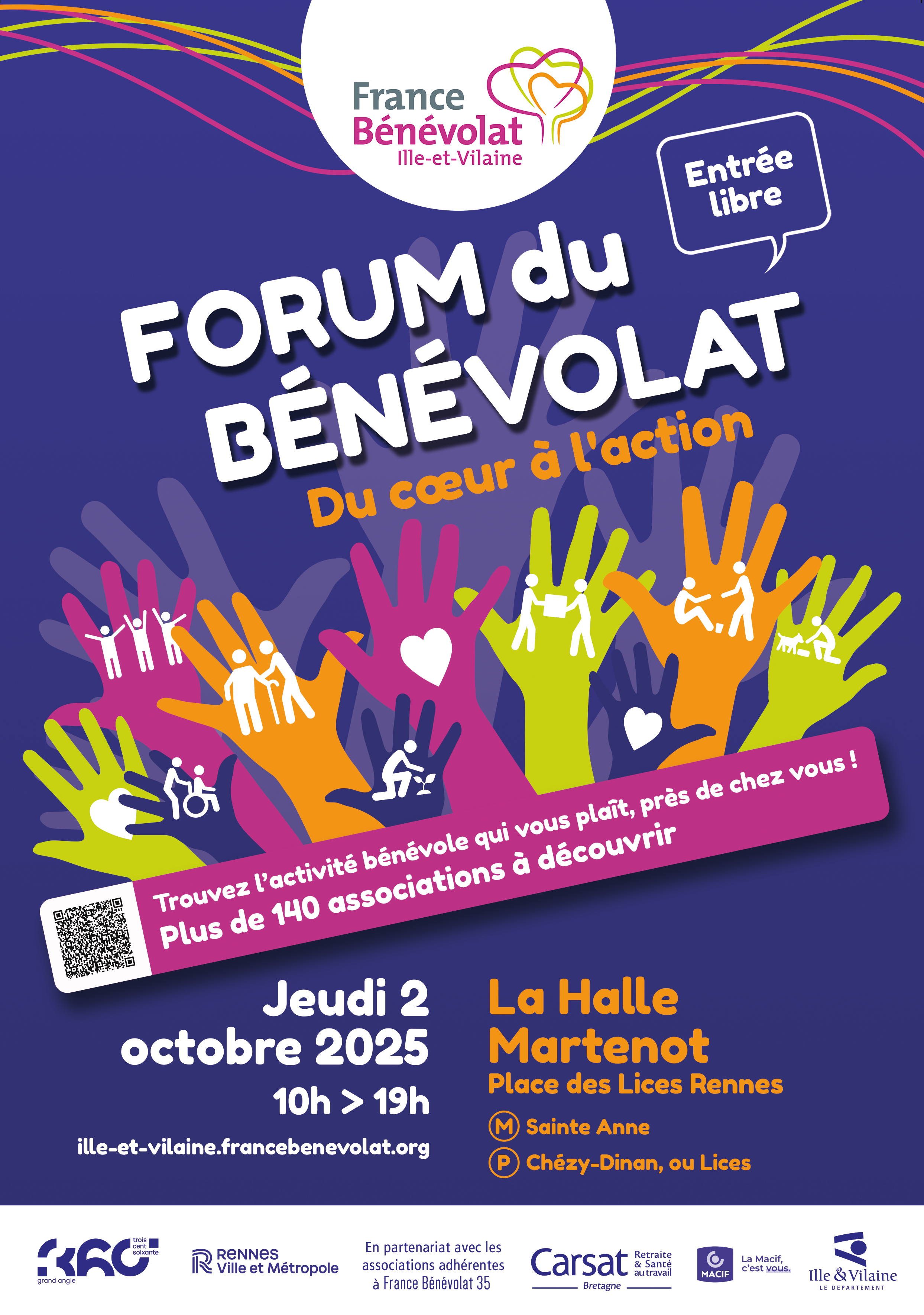 Le forum du bénévolat organisé par France Bénévolat 35 revient pour une nouvelle édition le 2 octobre 2025 à la Halle Martenot à Rennes. Candidat au bénévolat ou association cherchant des bénévoles, cet événement est pour vous !